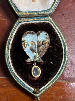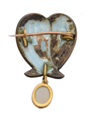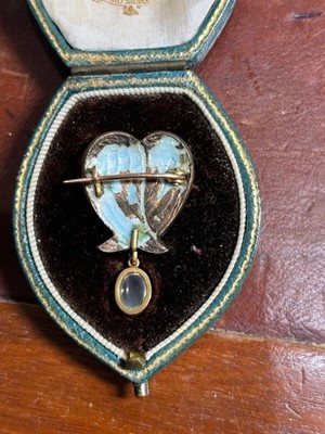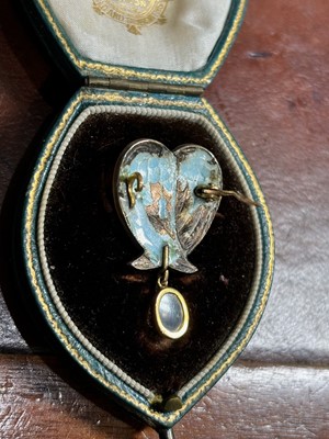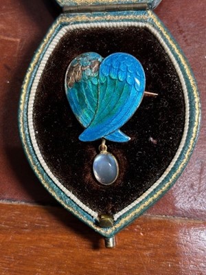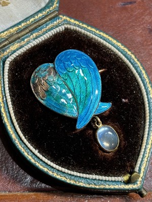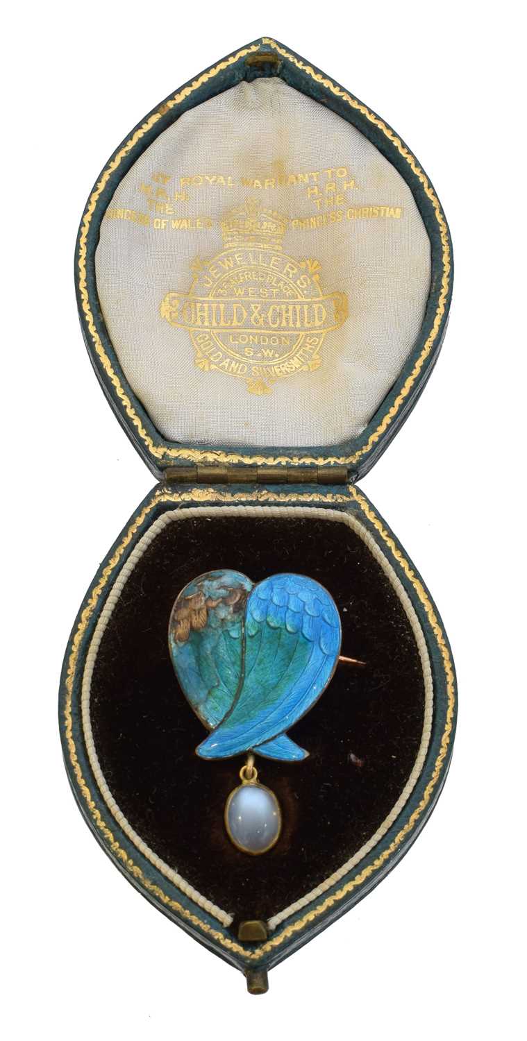 The blue and green enamel pair of wings suspending an oval moonstone cabochon drop, unmarked, length 3.5cm, gross weight 6.9g. In a fitted Child & Child case, monogrammed and dated V.A. 1907.