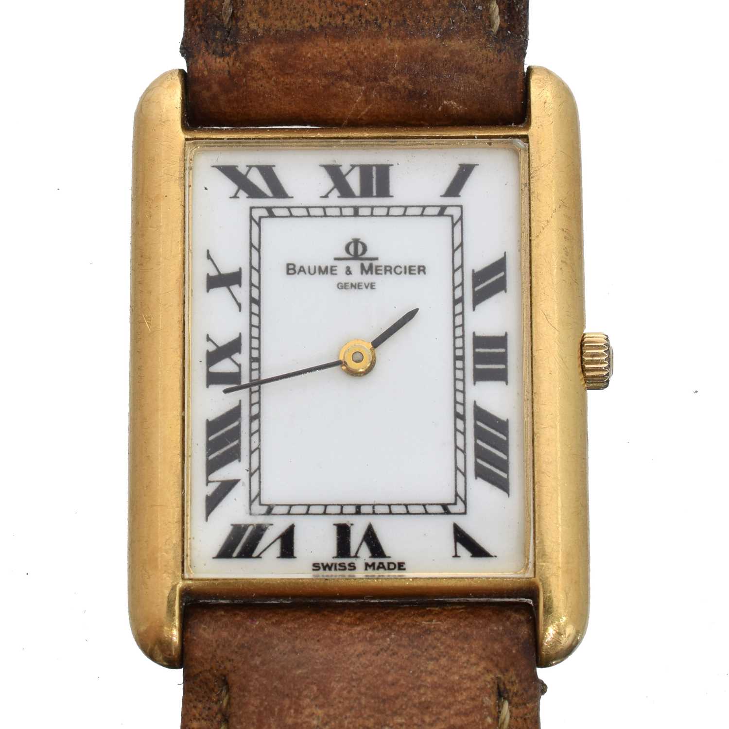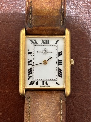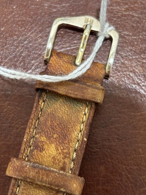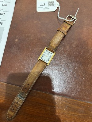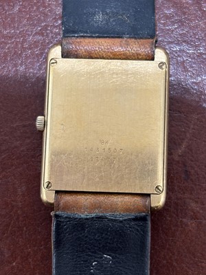The signed rectangular dial with roman numeral markers and inner chapter ring, quartz movement within an 18ct gold case bearing Swiss assay marks, numbered 1431507, with brown leather strap, case diameter 22mm.