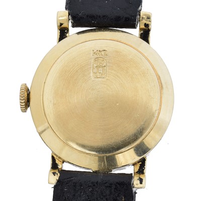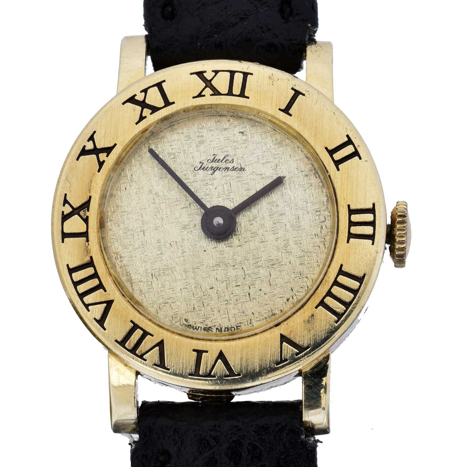 A Jules Jurgensen manual wind wristwatch, ref. 85073, the signed textured silver tone dial with an enamelled arabic marker bezel, signed 17 jewel manual wind movement within a 14k gold case numbered 46135, with leather strap, case diameter 23mm.