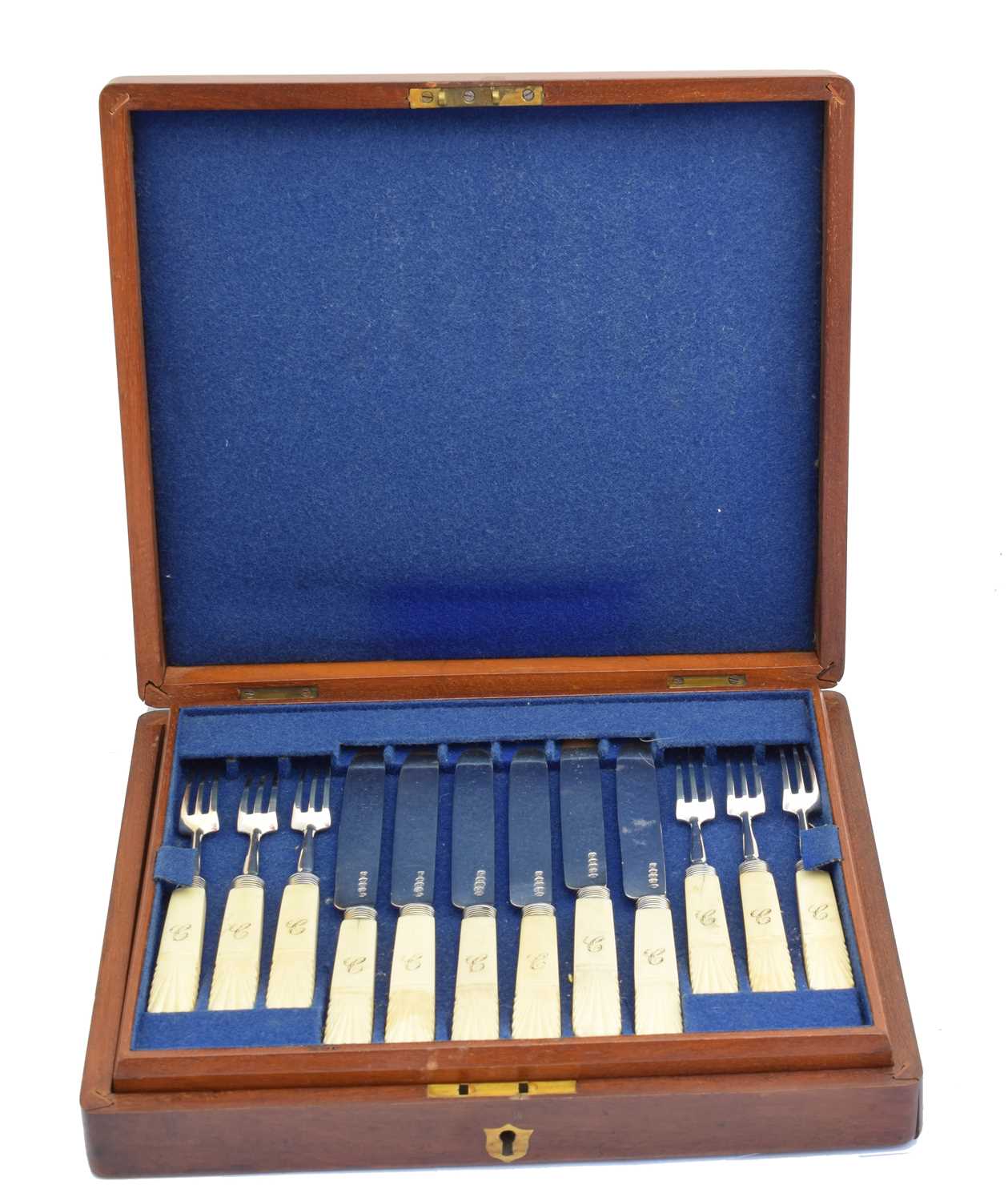 A William IV cased set of silver dessert knives and forks, with carved ivory handles bearing C monogram within a canteen, hallmarks for Joseph Willmore, Birmingham, 1832,