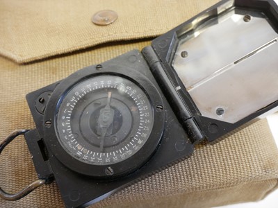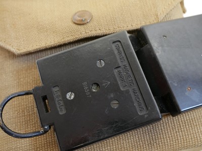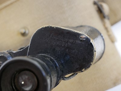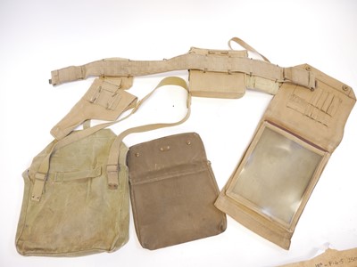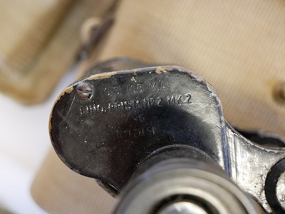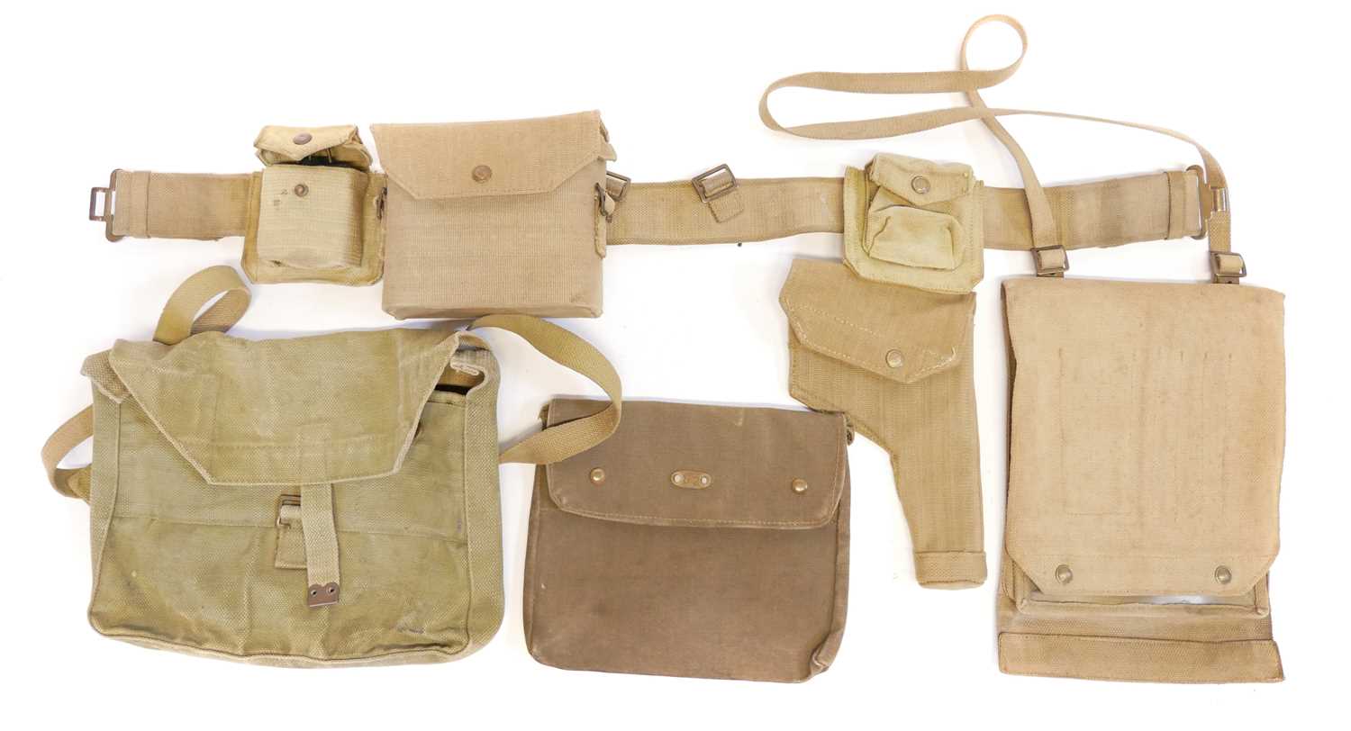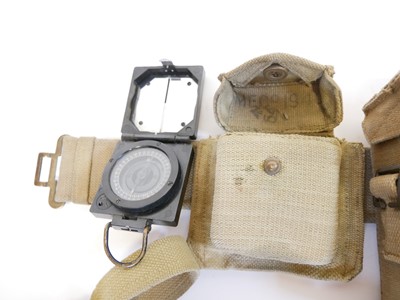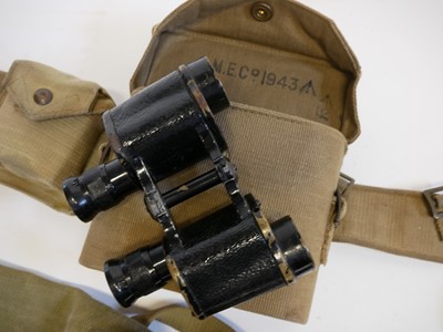 British WWII Officers webbing, to include a pistol holster and ammunition pouch stamped Bagcraft ltd 1942, compass pouch and binoculars case and haversack with strap stamped MECO 1940 and 1943, 1937 pattern belt with indistinct maker mark, Magnetic Marching Compass MkI by TG Co. Ltd, also a pair of Bino Prism No.2 MkII x6 Binoculars by A Kershaw and son 1940, a map case dated 1944, marked PSS VC8136 and a documents pouch stamped 62.