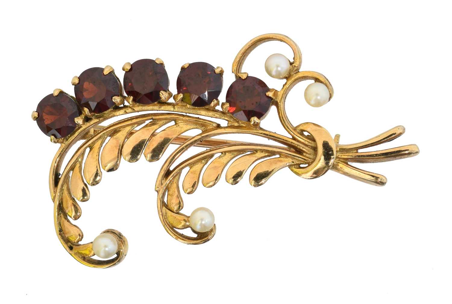 Designed as a foliate spray, set with circular shape garnets and cultured pearls, maker's marks for Cropp & Farr, hallmarks for Birmingham, 1958, length 3.9cm, gross weight 5.8g.