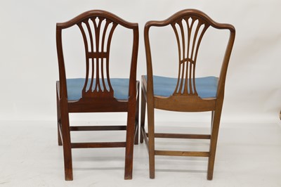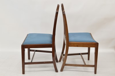 A set of six Hepplewhite design mahogany framed single dining chairs, each with humpback, pierced splat, drop-in seat, square section tapering legs, united by "H" shaped stretchers, also a further four dining chairs of a similar design with moulded forelegs supports, all ten chairs reupholstered in matching blue fabric.