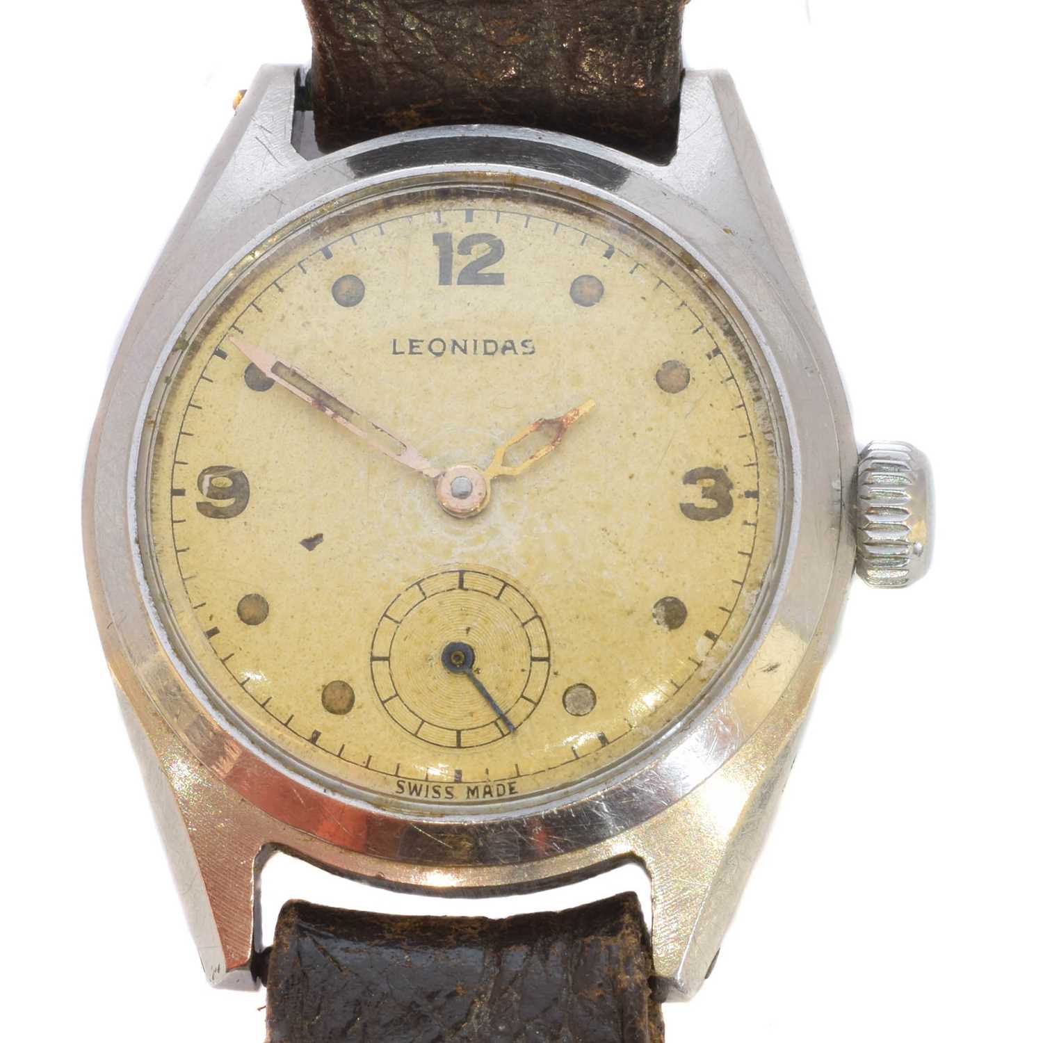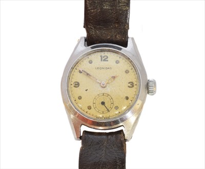 A stainless steel Leonidas military wristwatch, the circular signed dial with luminescent Arabic and dot hour markers, subsidiary seconds dial to 6 and outer minutes track, 15 jewel movement signed M.W.Co, within a stainless steel case, case diameter 28mm.