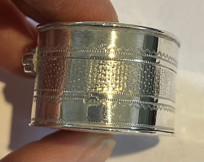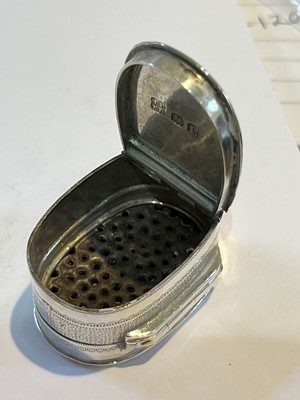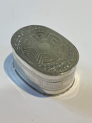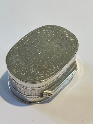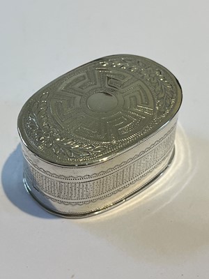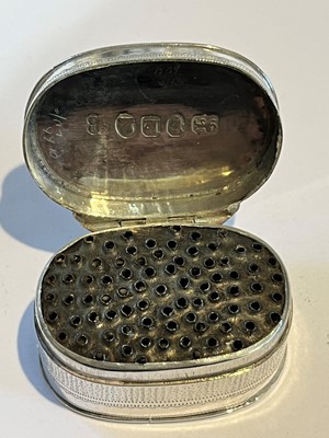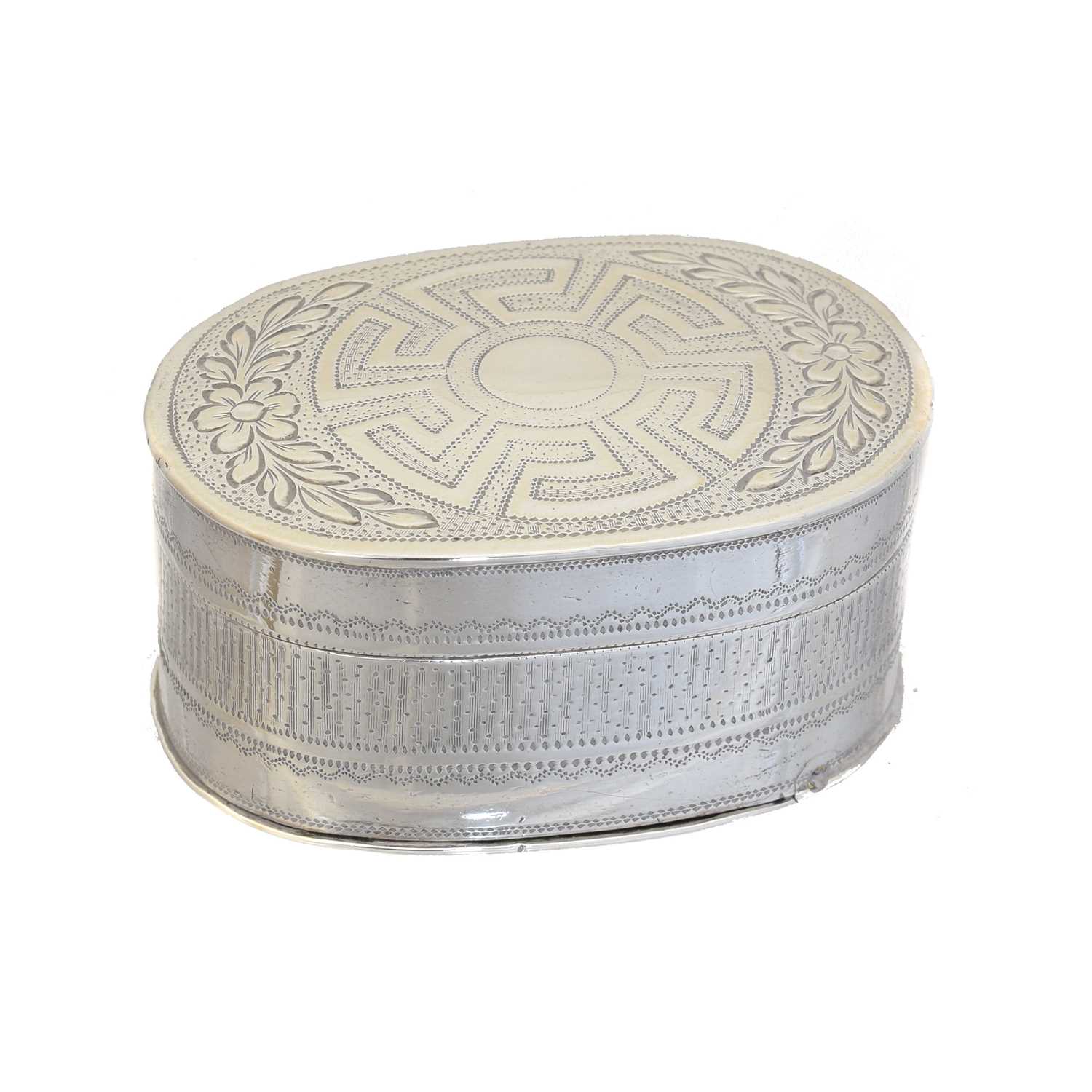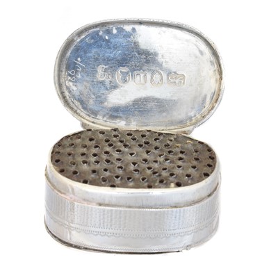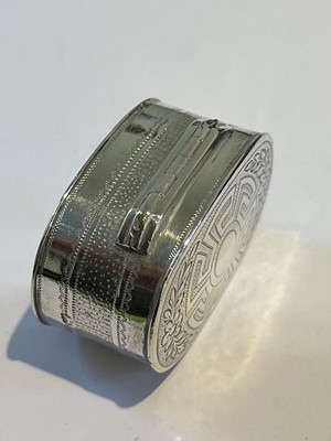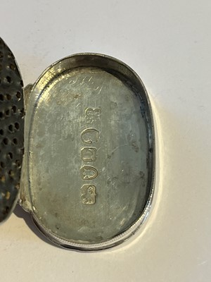 A George III silver nutmeg grater, oval shaped with engraved detailing, Thomas Phipps & Edward Robinson, London, 1806, gross weight 1.05ozt.