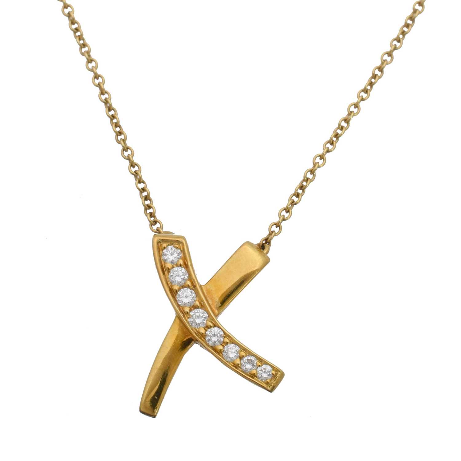 The stylised cross with brilliant cut diamond accents, suspended from an integral trace link chain, signed Paloma Picasso, stamped T&Co and 750, chain with French assay marks, length 40cm, gross weight 2.8g. In maker's box.