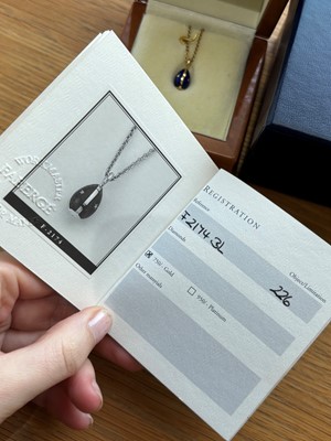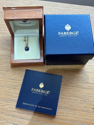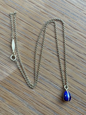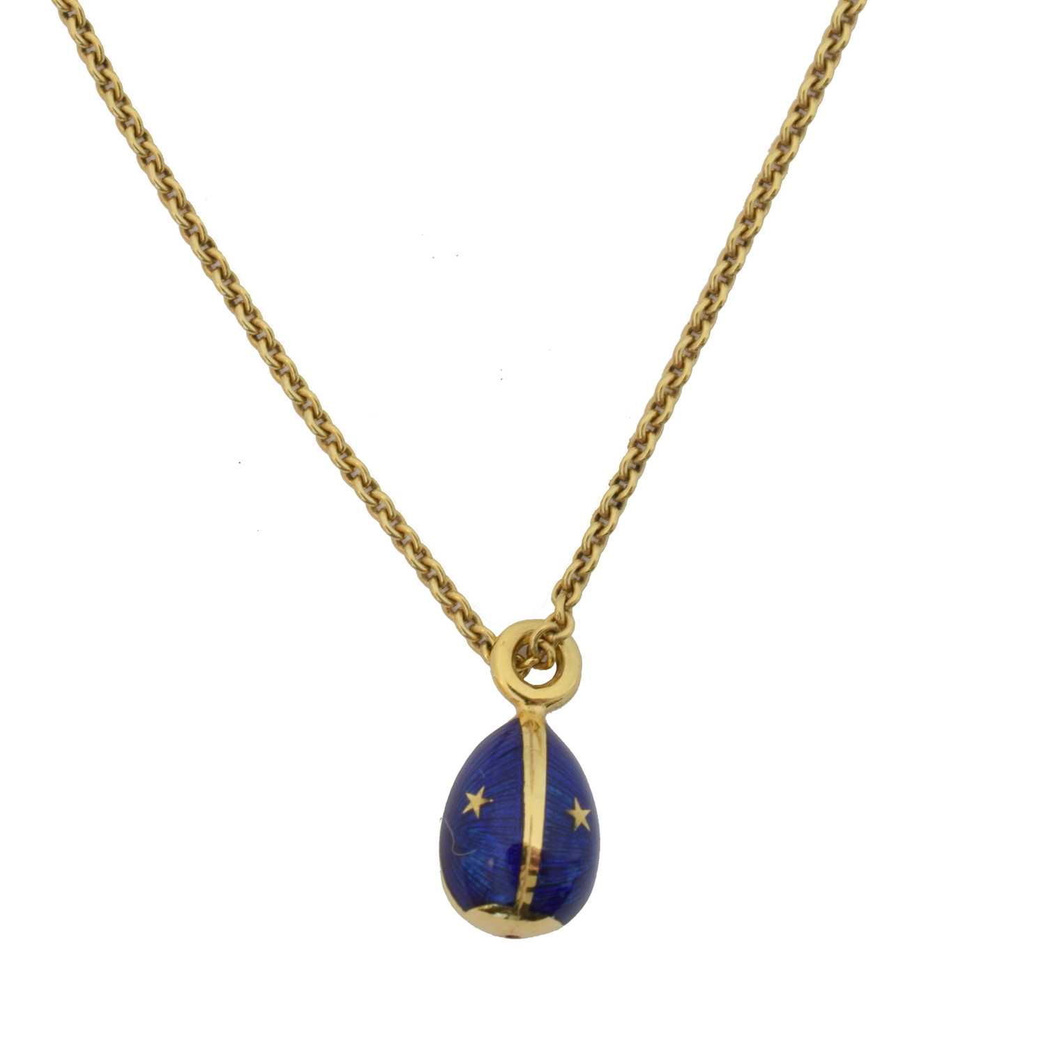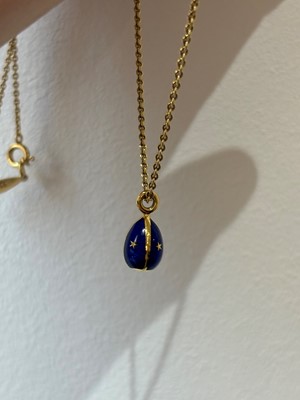 The blue guilloche enamel egg with star detailing, suspended from a trace link chain, signed Fabergé, numbered 226, hallmarks for London, 2005, length of pendant 1.5cm, length of chain 42cm, gross weight 6.4g. With maker's box and certificate of authenticity, ref. F21743L.