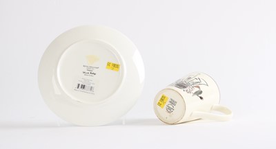 The mug with printed Designed by Eric Ravilious and Wedgwood Etruria marks, the side plate with printed facsimile signature and factory marks.