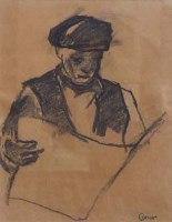 Lot 574Style of William Conor, Man reading a paper, charcoal.