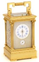 Lot 395French gilt brass striking and repeating alarm carriage clock, the white enamel Roman dial and alarm set enclosed within a gilt guilloche mask, eight