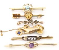 Lot 3639ct gold and amethyst bar brooch; 14ct gold three