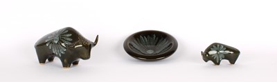 Lot 105Michael and Elizabeth Skipworth for Stoke Gabriel Pottery Two Graduated "Lotus" Bulls & Bowl