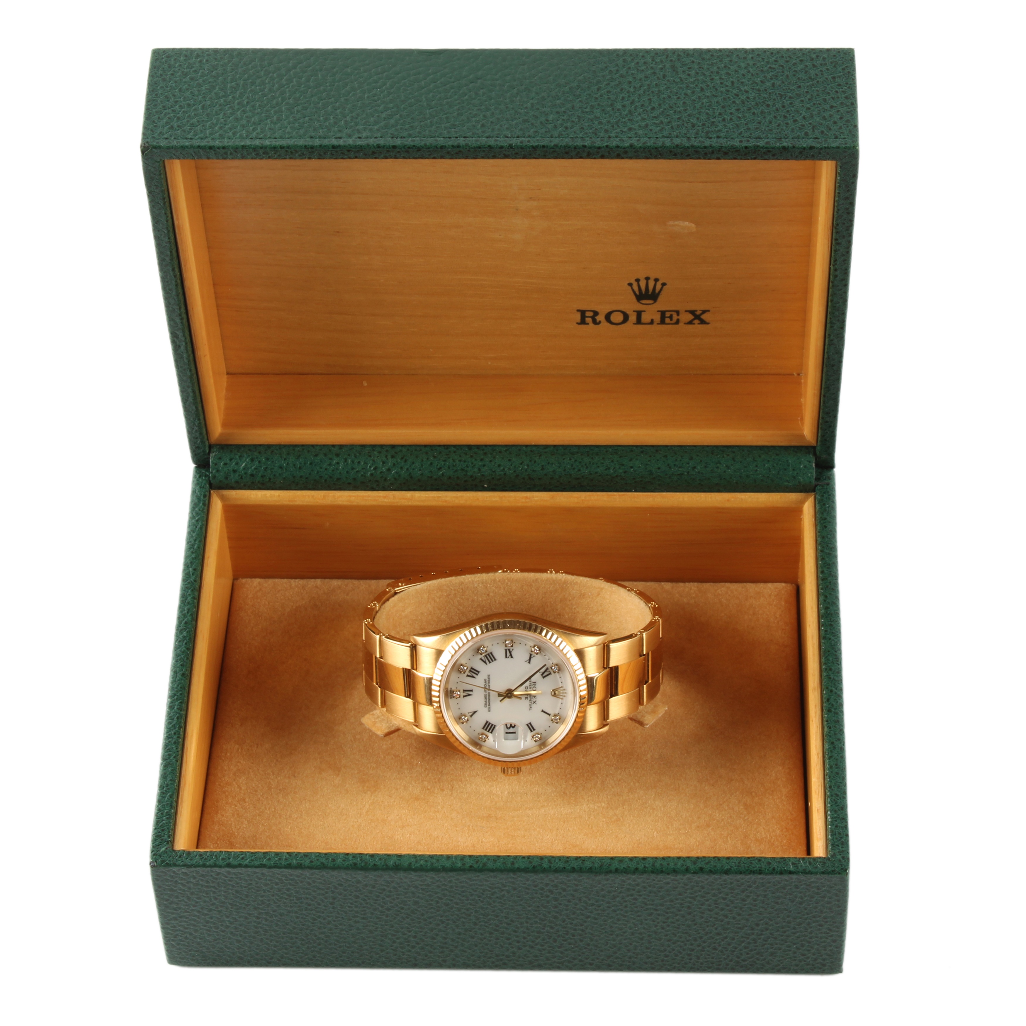 A Rolex is more than a watch—it’s a legacy. This 18ct gold Datejust is a rare find, featuring a white diamond-dot dial paired with Roman numerals, framed by a classic fluted bezel, and finished with the iconic Oyster Perpetual bracelet. The white diamond-dot dial is particularly scarce, making this piece a collector’s dream and a symbol of enduring sophistication.