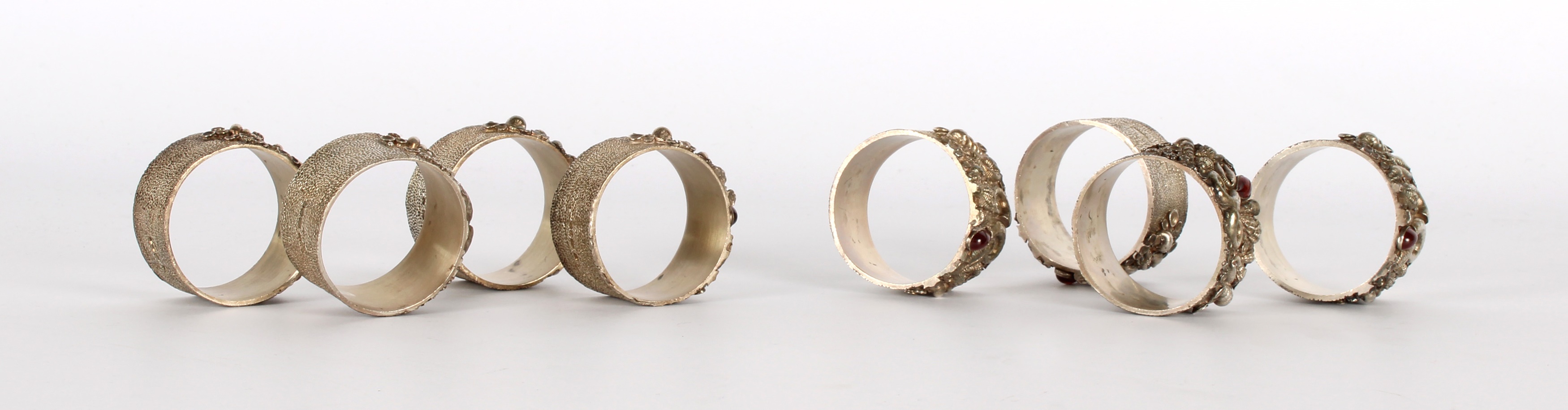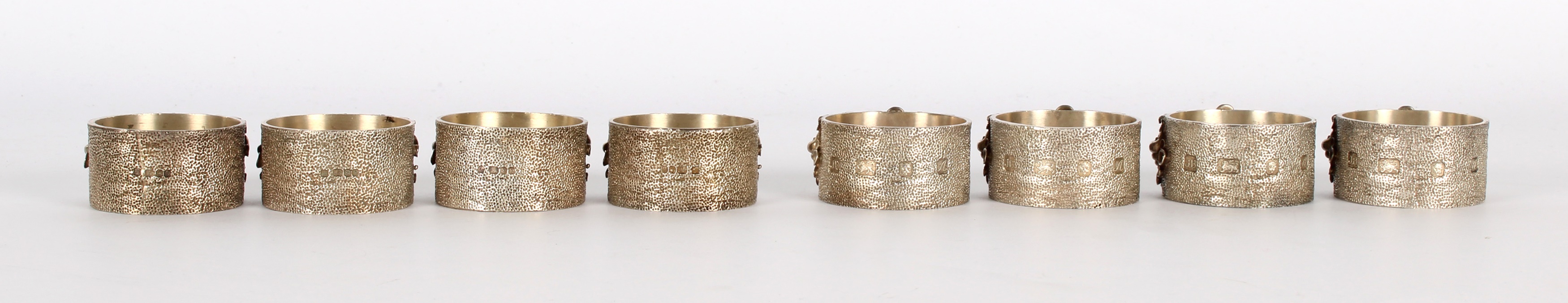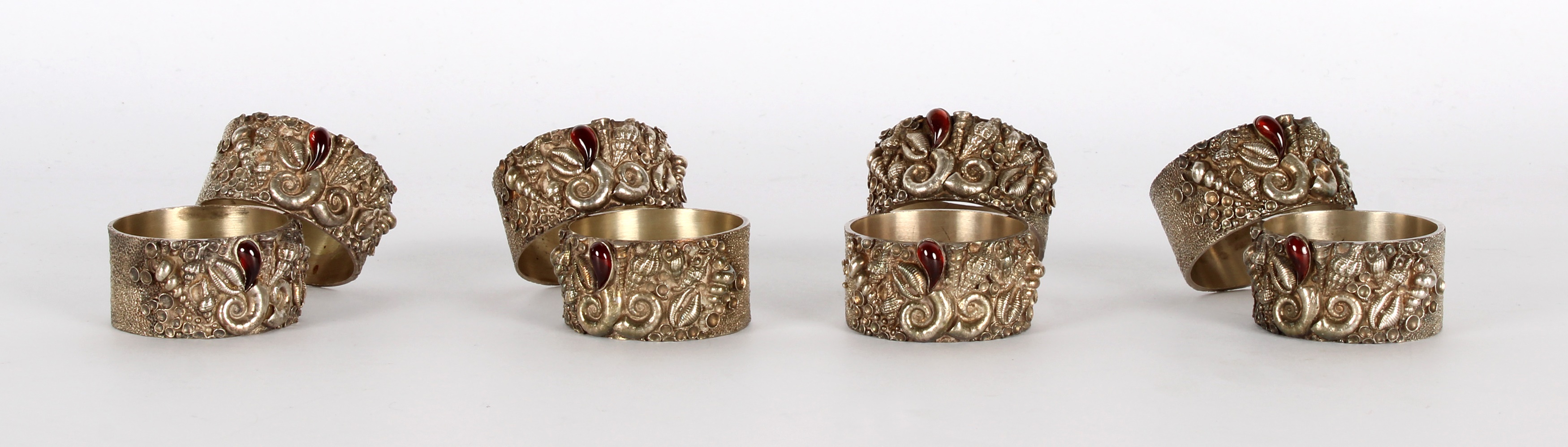 This exciting lot presents a very rare opportunity to acquire eight of these beautiful and dramatic napkin rings, comprising two sets of four hallmarked for London 1975 and 1978 respectively (the earlier set with large marks), of heavy gauge with ornately cast 'shell' design in high relief against a textured ground, each set with an assymetrically cut garnet.