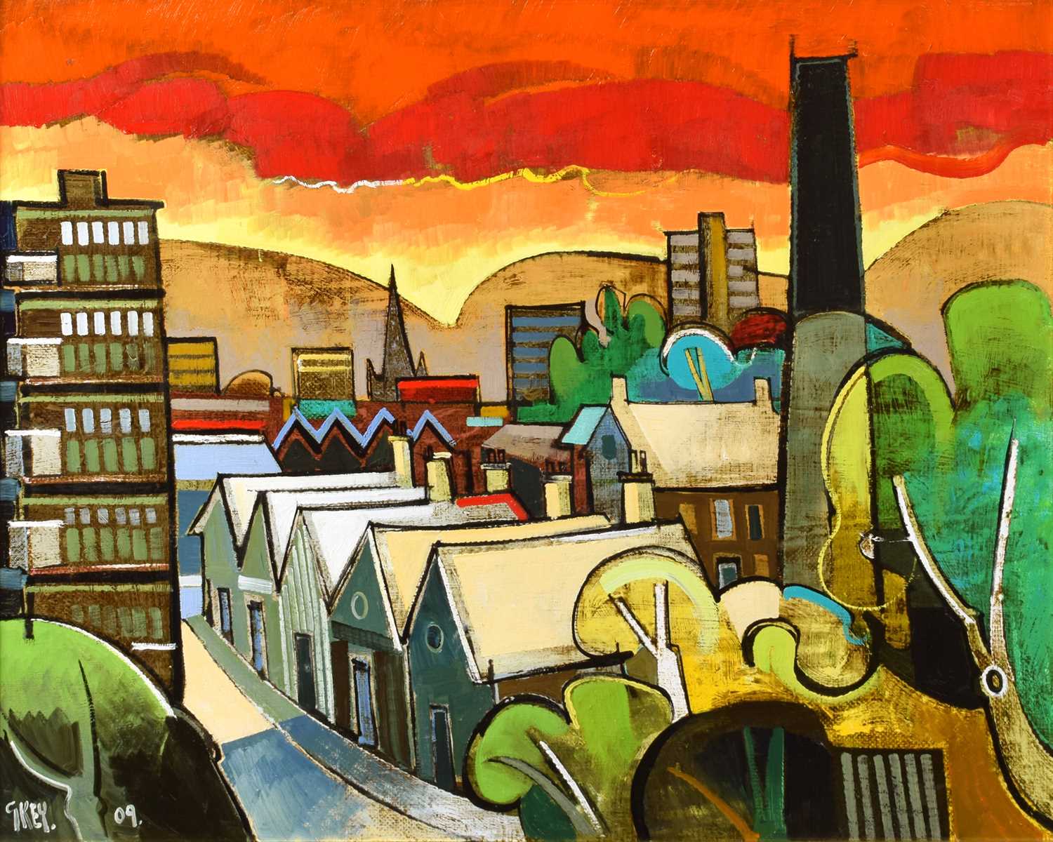 Geoffrey Key (British 1941-), "Mill Town with Red Sky", oil on canvas. Sold: £9,000